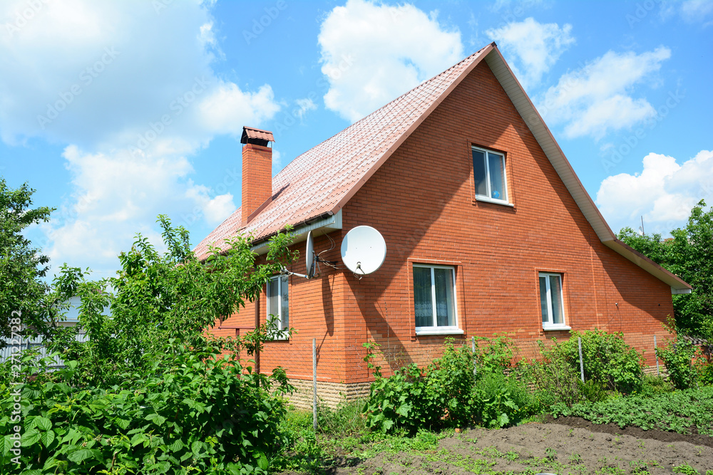 Cozy Brick House With Antenna And Metal Roof Stock Photo Adobe Stock